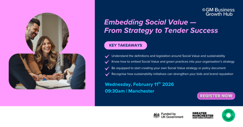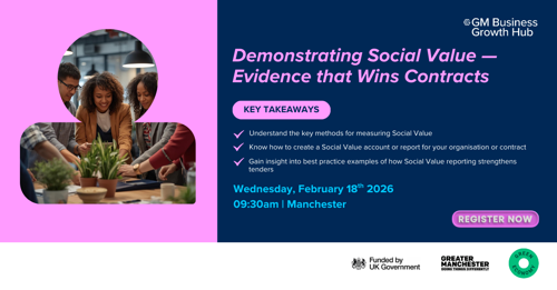This workshop helps you understand what Social Value really means and how to embed it within your organisation’s strategy to create meaningful impact. You’ll learn how to develop a Social Value Strategy and Policy, explore measurement frameworks, and see best practice examples from Greater Manchester that show how businesses are integrating sustainability and social impact into their operations.