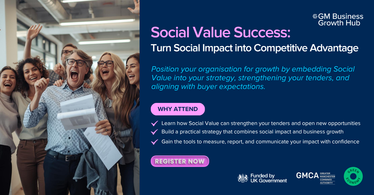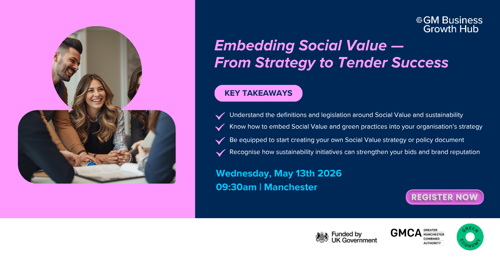 This workshop helps you understand what Social Value really means and how to embed it within your organisation’s strategy to create meaningful impact. You’ll learn how to develop a Social Value Strategy and Policy, explore measurement frameworks, and see best practice examples from Greater Manchester that show how businesses are integrating sustainability and social impact into their operations.