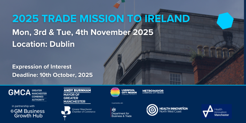 Join Greater Manchester and Liverpool City Region Combined Authorities along with the Mayor of Greater Manchester, Andy Burnham and the Mayor of Liverpool City Region, Steve Rotheram on an International Trade Mission to Dublin, Ireland. The mission is organised in partnership with the GM Business Growth Hub and Health Innovation North West Coast, as well as the support from the Department for Business and Trade (DBT), Greater Manchester Chamber of Commerce and Health Innovation Manchester.