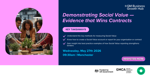 This workshop helps you understand what Social Value really means and how to embed it within your organisation’s strategy to create meaningful impact. You’ll learn how to develop a Social Value Strategy and Policy, explore measurement frameworks, and see best practice examples from Greater Manchester that show how businesses are integrating sustainability and social impact into their operations.